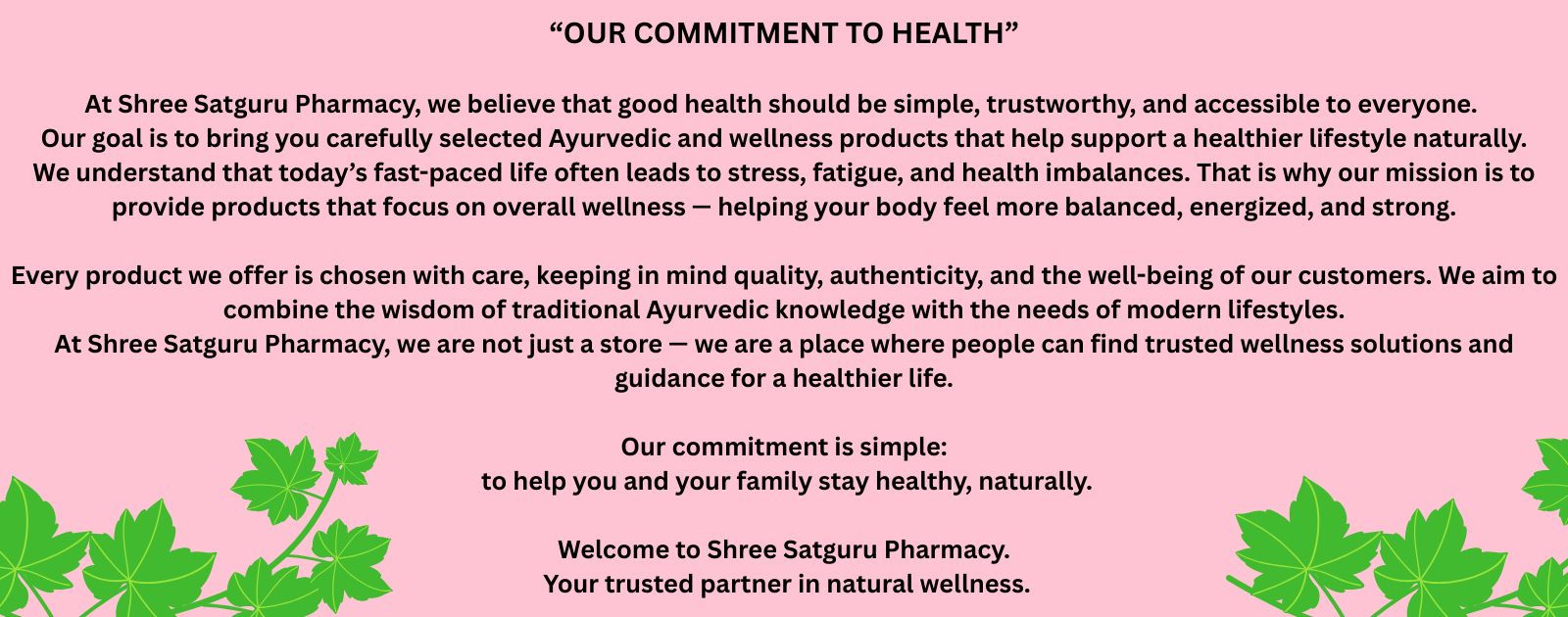 At Shree Satguru Pharmacy, we deliver the perfect balance of trusted pharmaceutical care and authentic Ayurvedic wisdom. Our products are formulated using high-quality, safe, and natural ingredients to support your health journey with reliability and care. With a strong commitment to purity, transparency, and patient well-being, we ensure that every product meets the highest standards of safety and effectiveness. Our mission is to nurture your body, mind, and overall wellness, helping you achieve a healthier, stronger, and more balanced life every day.